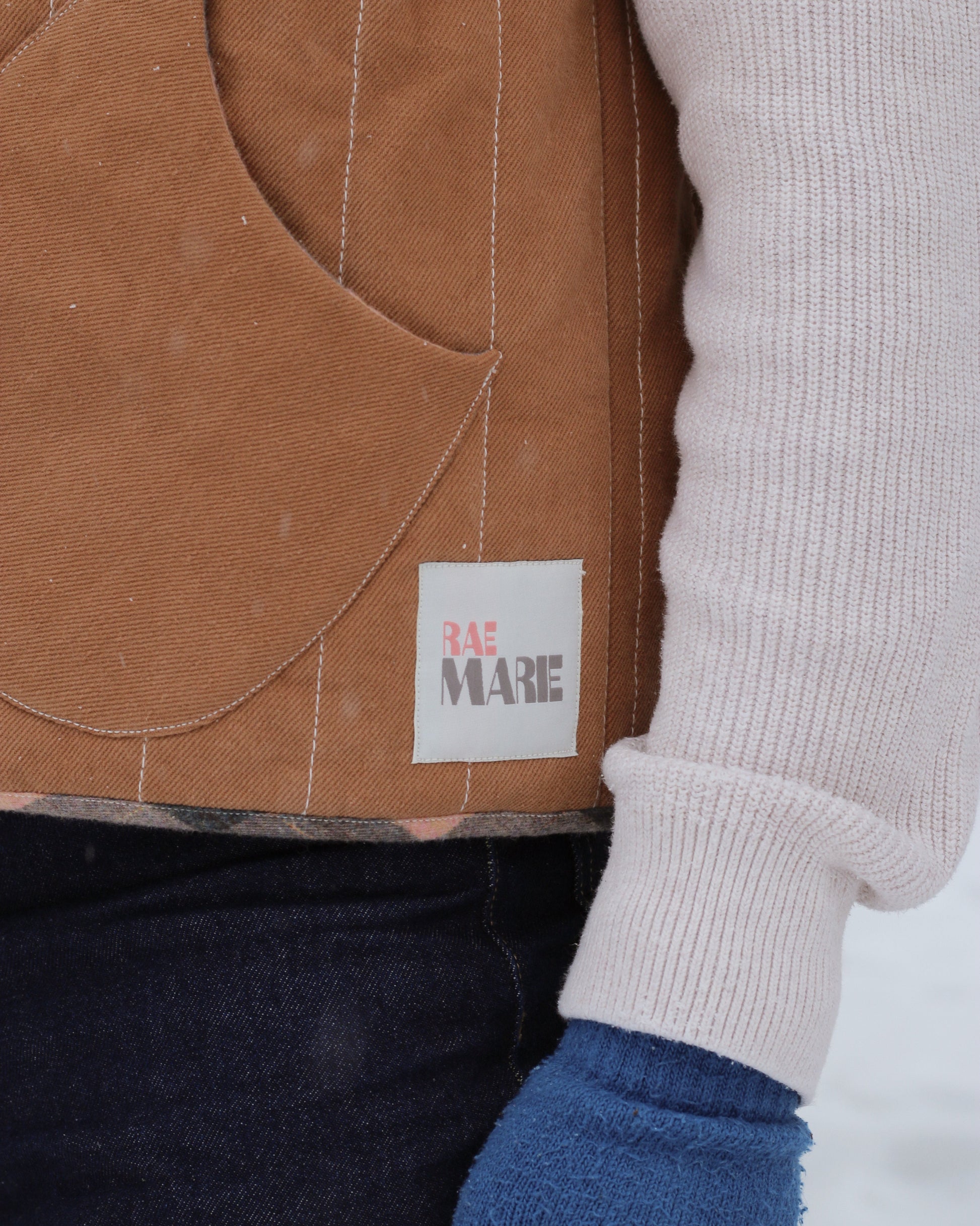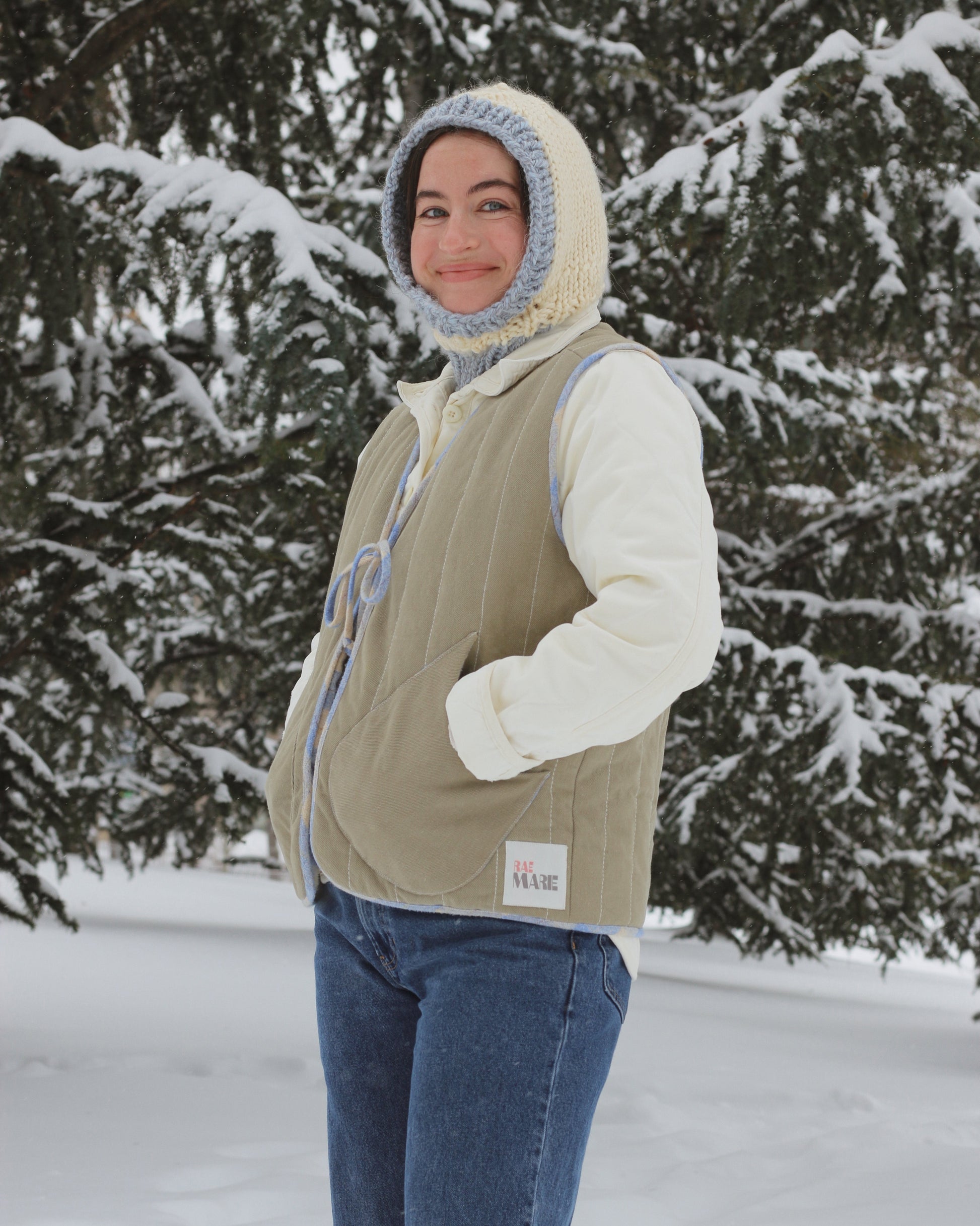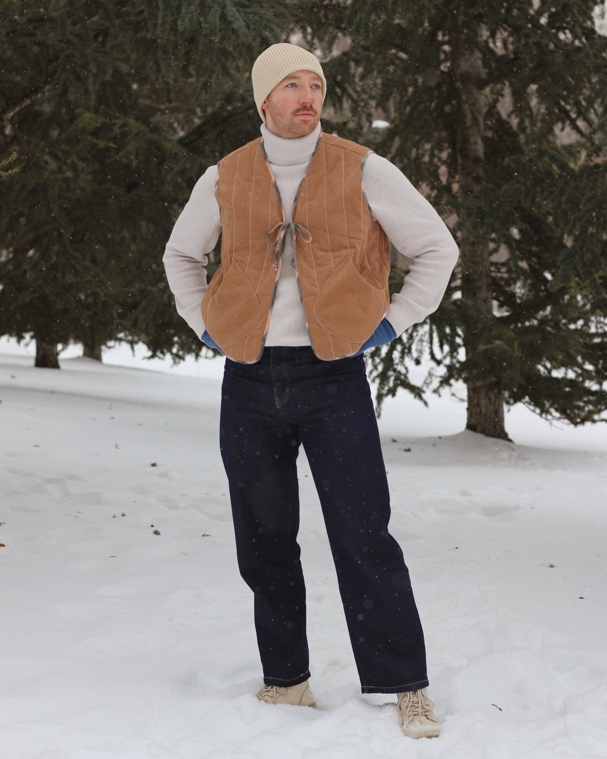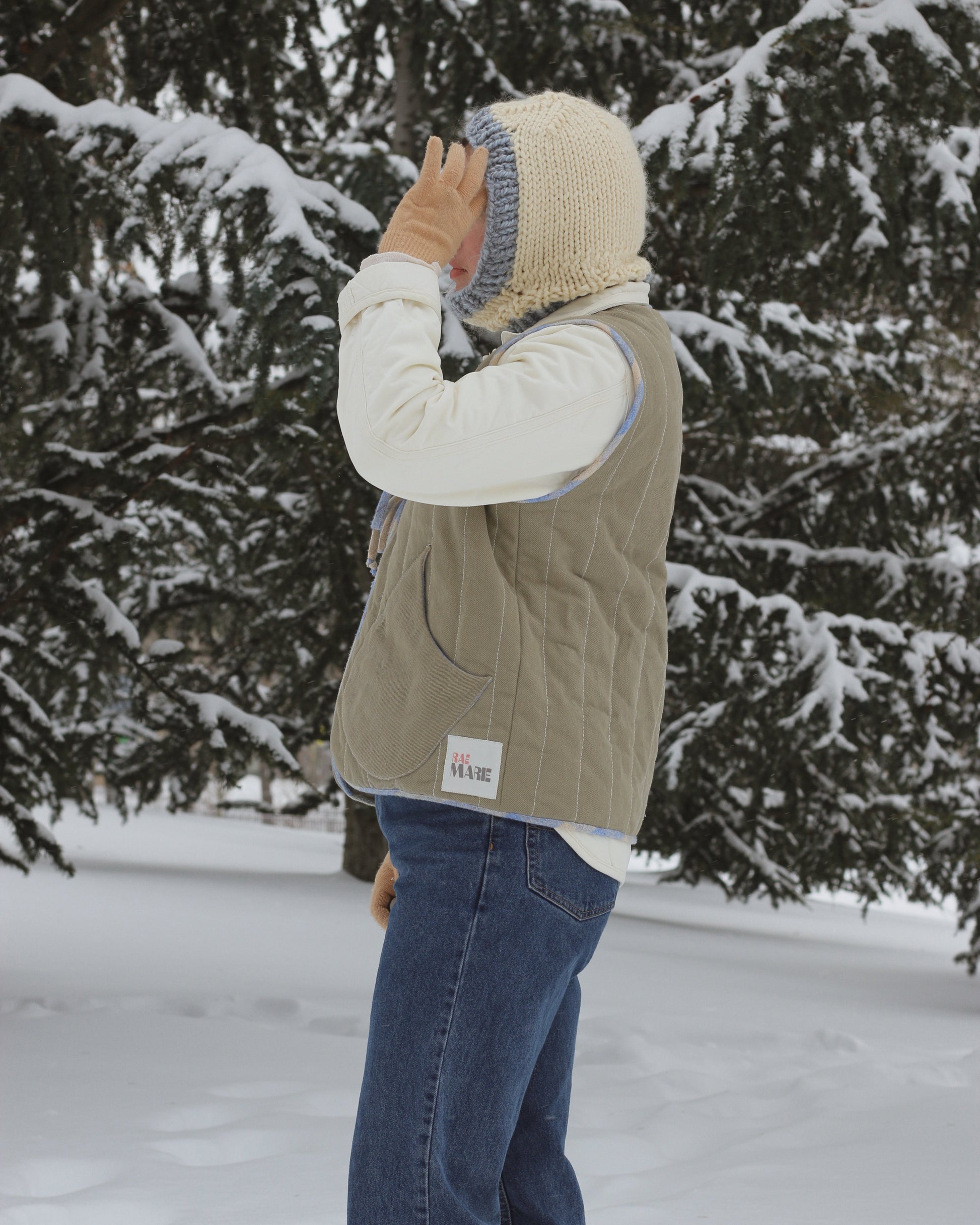 Our first piece of outwear! Each Quilted Vest is insulated with repurposed fabric scraps that were cut into small bits and pieces that I call "fabric confetti". These fabric scraps are machine-quilted between a layer of twill denim and a polyester batting. The result is a thick and warm layer perfect for cold weather seasons. These pieces are fully lined with a soft flannel and they were designed to have a boxy silhouette so you can wear bulkier layers underneath. They also feature a front tie closure and deep front pockets.